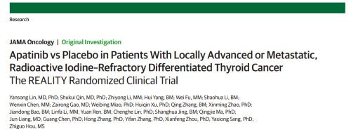 2021年12月16日,权威医学杂志《JAMA Oncology》(影响因子31.777)在线发表阿帕替尼的一项III期临床研究(REALITY)——甲磺酸阿帕替尼片治疗局部进展/转移性放射性碘难治性分化型甲状腺癌(RAIR-DTC)患者的多中心、随机、双盲、安慰剂对照临床研究。此研究由北京协和医院的林岩松教授和南京金陵医院的秦叔逵教授发起,在全国21个研究中心展开,由DG视讯医药中央医学事务部团队支持完成。