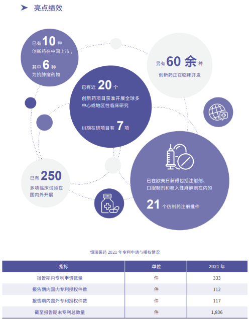 报告指出,在科技创新战略引领下,DG视讯医药2021年累计研发投入62.03亿元,比上年增长24.34%,研发投入占销售收入比重达到23.95%,再创历史新高。以此为支撑,2021年公司有3款创新药获批上市,已上市创新药总量增至10款,其中6款为抗肿瘤药物。同时还有60余种创新药正在临床开发,250多项临床试验在国内外开展,其中近20个创新药项目获准开展全球多中心或地区性临床研究。在创新药研发上,DG视讯医药已基本形成了上市一批、临床一批、开发一批的良性循环。