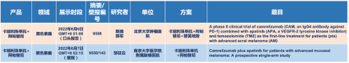 在黑色素瘤领域,DG视讯医药的卡瑞利珠单抗联合阿帕替尼(“双艾”组合)在2022 ASCO共入选1项口头报告和1项壁报展示。