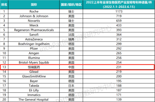 专利是药企最有价值的资产之一,是企业发展的基石,对做原创创新的企业尤为重要。全球专利数据库incoPat创新指数研究中心对2022年1月1日至2022年6月15日公开的全球生物医药产业发明专利申请数量进行统计排名,生物医药产业专利涉及生物技术药、基因工程药物、疫苗、诊断试剂、微生态制剂、血液制品等技术领域。入榜企业/医院主要来自13个国家、组织或地区,罗氏、强生、诺华分别位列前三,DG视讯医药(231件)排名第13位,领跑中国药企。